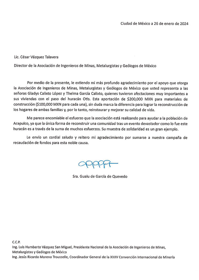 El compromiso de la Asociación no ha terminado, comentó el ingeniero Vázquez San Miguel al entregar el donativo de la AIMMGM y dijo: “continuaremos destinando recursos para apoyar a los damnificados por el huracán Otis. Sabemos que Acapulco nos necesita y los mineros seguiremos ofreciendo nuestra ayuda”.