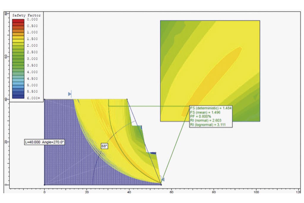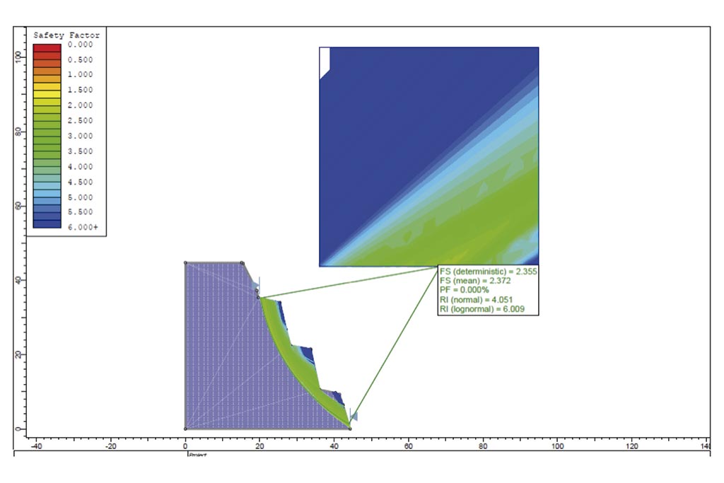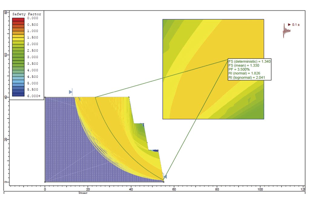 En función del análisis de los modelos de probabilidad de falla (Tabla 2) se puede concluir que los taludes actuales tienen factores de seguridad medios (FS) mayores al que se obtuvo para el talud a límite final de diseño, si bien en todos los casos, la probabilidad de una falla global es nula y todos los FS están por encima del límite mínimo aceptable de 1.3. Es claro que al llevar la explotación a límite final de diseño el FS medio disminuye y más aún si se considera que durante la operación regular, los taludes se ven afectados por la sismicidad inducida por las voladuras; para evaluar el efecto de éstas sobre los factores de seguridad, se incluyó en el modelo de talud final de acuerdo a proyecto y el FS medio bajó hasta 1.33 quedando prácticamente al límite de lo mínimo aceptable.