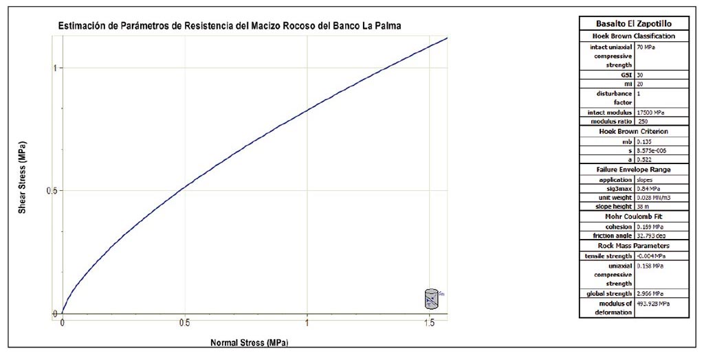 Tomando como fundamento las estructuras que afectan el macizo rocoso de la cantera, se estimaron los valores de GSI, mi y de σc (resistencia a compresión simple) y se aplicaron al programa RocData para definir los parámetros de resistencia global del macizo rocoso (Rock Mass Strenght o RMS) obteniéndose los siguientes resultados: cohesión ( c )=169 KPa; ángulo de fricción (φ)= 32.79º (Figura 2).