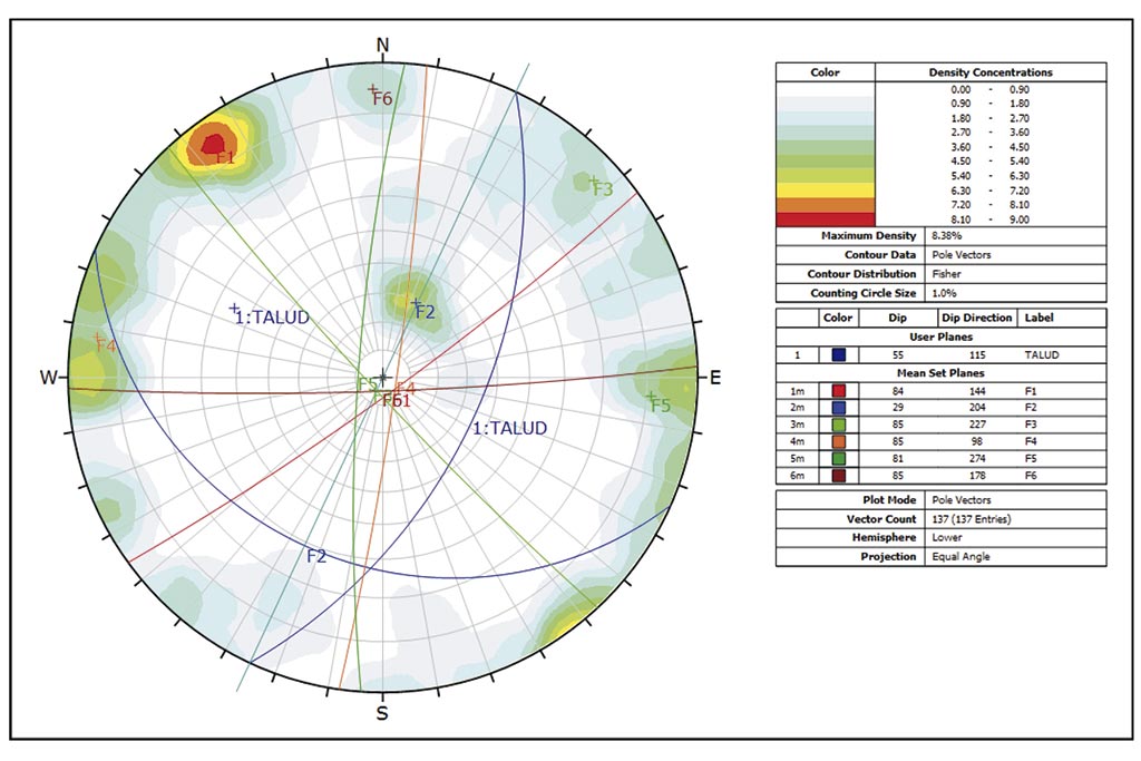 En función de la modelación estereográfica de todas las estructuras identificadas en los taludes de la cantera se definieron 6 familias de juntas (Tabla 1 y Figura 3). Dadas las condiciones de riesgo, no se pudo realizar levantamiento estructural en algunas áreas.