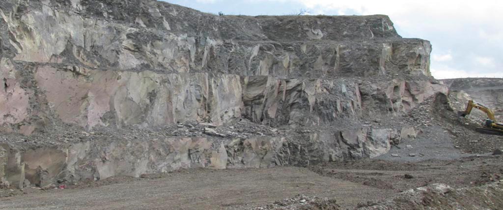 Fotografía 1. Aspecto del macizo rocoso en uno de los bancos de explotación de la capa superficial. Se puede apreciar la naturaleza laminada o “en lajas” del material y los planos estructurales lisos.