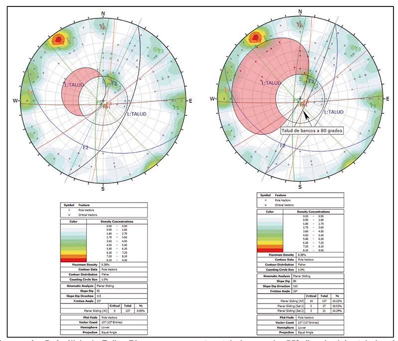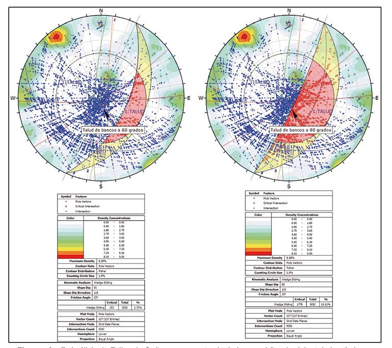 El análisis cinemático muestra una correlación directa entre el incremento del ángulo del talud y el aumento de las intersecciones que pueden ocasionar fallas planas, de cuña y por toppling directo.