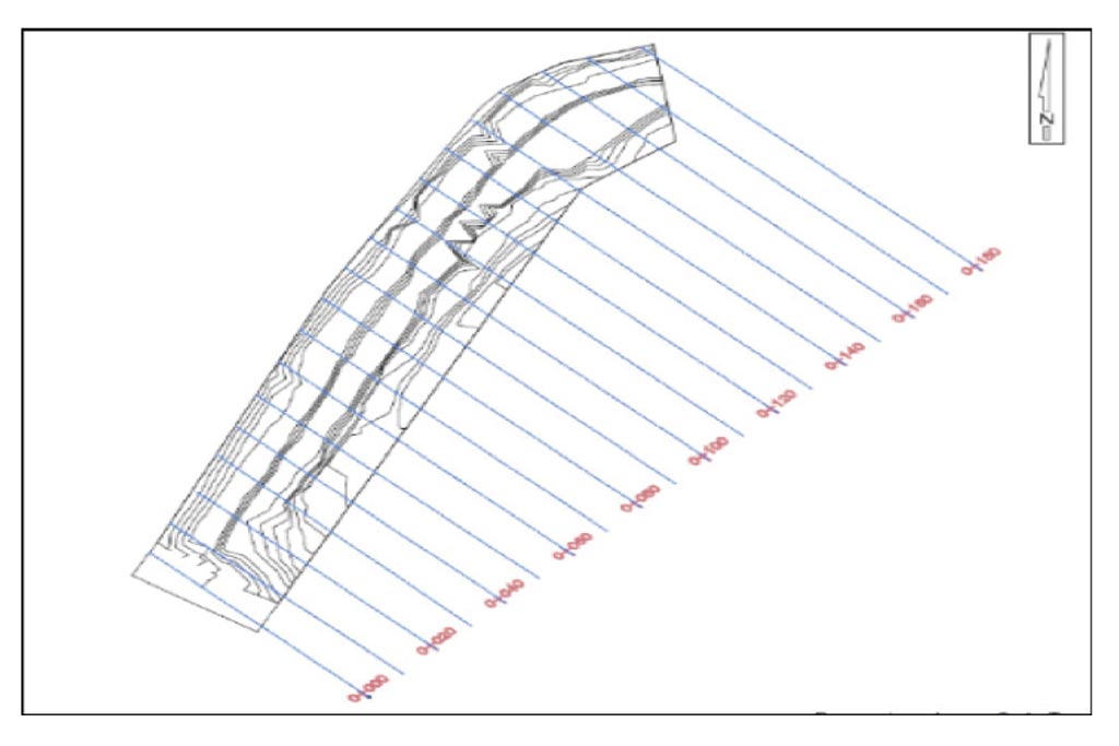 A efecto de evaluar la estabilidad global de la cantera actual y comparar contra la cantera a límites de diseño se prepararon modelos de probabilidad de falla de los taludes en diferentes secciones (Figura 10) con el programa SLIDE. En ambos casos se integran las topografías presente y propuesta y los parámetros de resistencia del macizo rocoso (RMS) estimados en el punto 2 Caracterización Geomecánica de MR.