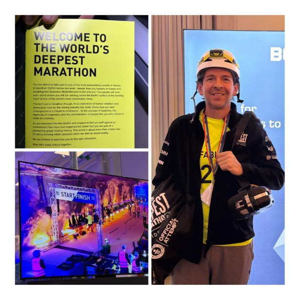 27 de octubre 2025.- A una profundidad de 1,120 metros, con una temperatura de 24 grados, y 70% de humedad, el mexicano Fabián Casaubón, llegó a la meta del World Deepest Marathon, con un tiempo de 4:46:15. Fue un gran esfuerzo, ejemplo de perseverancia, pues el evento se realizó al interior de la mina Garpenberg, en Suecia.
