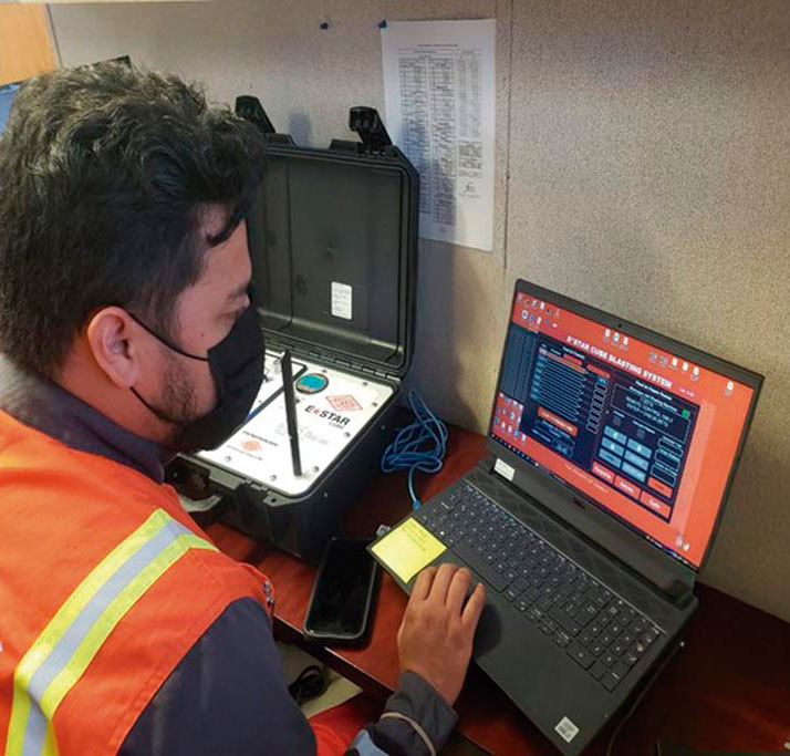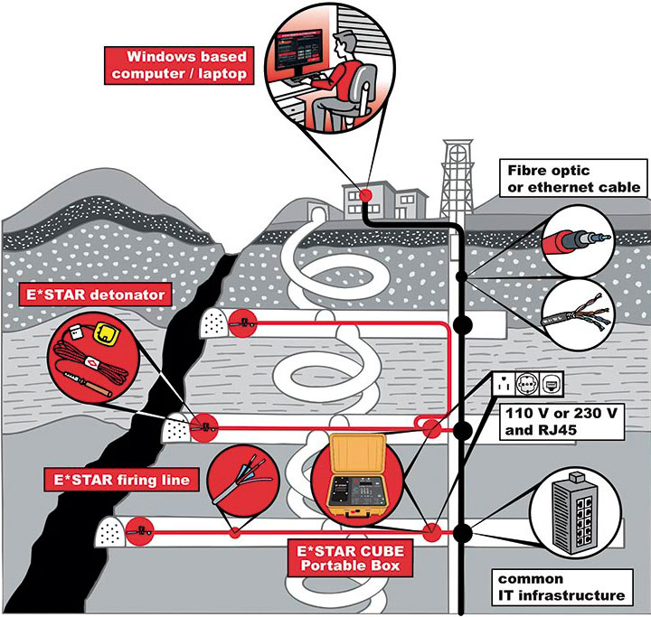 El sistema combina detonadores electrónicos E*STAR con tecnologías avanzadas de comunicación, integrándose a la infraestructura existente de la mina mediante fibra óptica, Ethernet, Wi-Fi o LTE. Esta arquitectura establece una comunicación bidireccional en tiempo real entre los equipos subterráneos y el software de control, operado desde una computadora o una tablet autorizada.