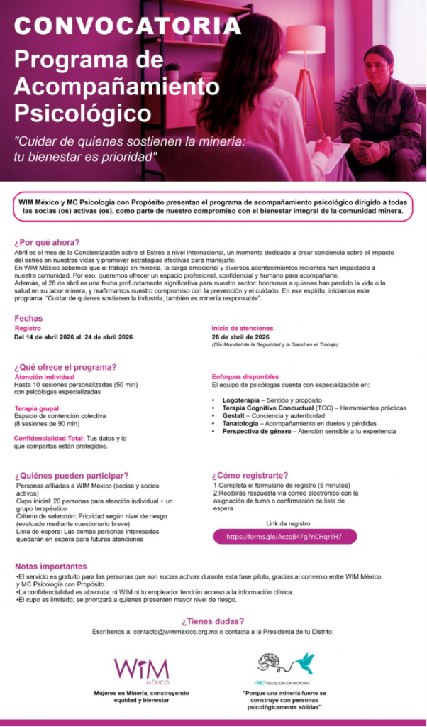 15 de abril 2026.- La organización WIM México, en colaboración con MC Psicología con Propósito, anunció el lanzamiento de un programa de acompañamiento psicológico dirigido a personas afiliadas activas del sector minero, con el objetivo de atender el bienestar emocional dentro de la industria.